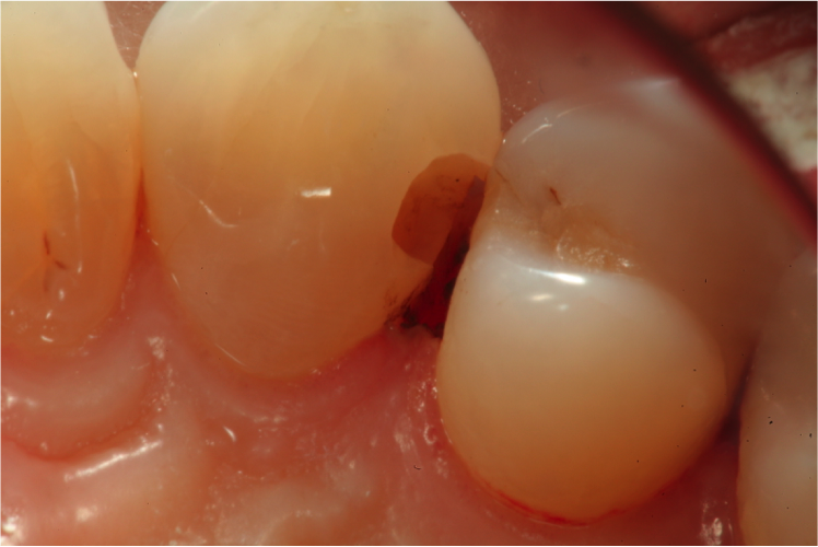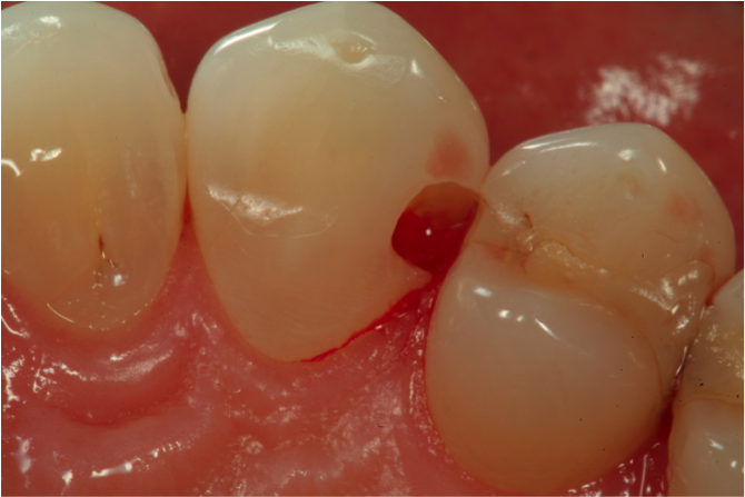 Figure 1 through Figure 5 illustrate the use of electrosurgery in the course of preparing a Class III cavity in the distal of a cuspid. In this situation, the electrosurgery unit was used to change a subgingival margin to supragingival, allowing for easier composite placement in an isolated field.