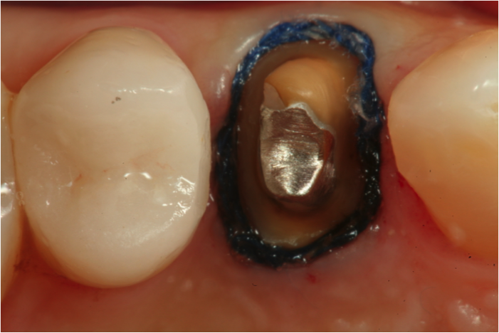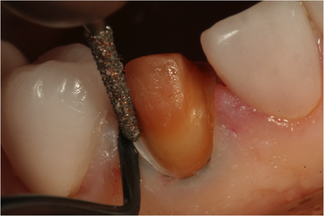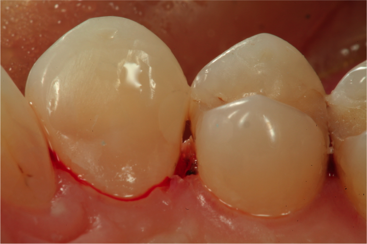 Figure 6 shows a premolar in a patient with thick tissue. Using electrosurgery to create a trough around this tooth (Figure 7) can significantly facilitate placement of the impression cord. An adequate zone of attached gingiva must be present, along with adequate horizontal gingival thickness. For a patient with a high smile line and thin anterior periotype, it may be advisable to trough on the palatal side of the tooth but not on the facial, where the esthetic result could potentially be affected.