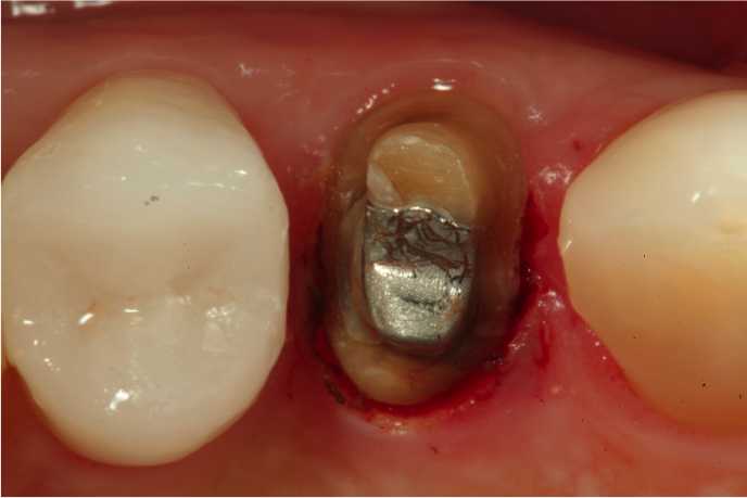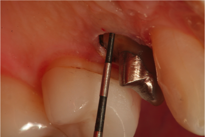 Bone sounding to determine that distance is thus an important and valuable diagnostic step. The goal is to determine whether sufficient attached tissue will remain below the corrected free gingival level. If not, ie, if the periodontal surgery will invade the biologic width, alternatives should be considered. Orthodontic extrusion might be advisable to relocate the osseous crest more coronally, compensating for subsequent osseous resorption and potentially greater soft-tissue loss.