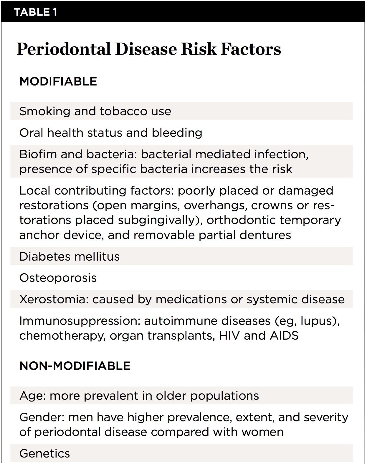 Periodontal disease risk factors are either modifiable, ie, those behaviors that can be changed, or non-modifiable, ie, those behaviors that cannot be changed (Table 1), and are further categorized based on their etiologies: systemic, genetic, environmental, or behavioral.