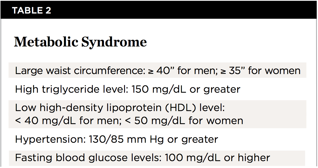 Metabolic syndrome is a cluster of risk factors that can occur in some individuals (Table 2). The risk for metabolic syndrome is closely related to obesity and a lack of physical activity. This cluster of risks should be taken into consideration during the screening and assessment of dental patients who are overweight or obese.15