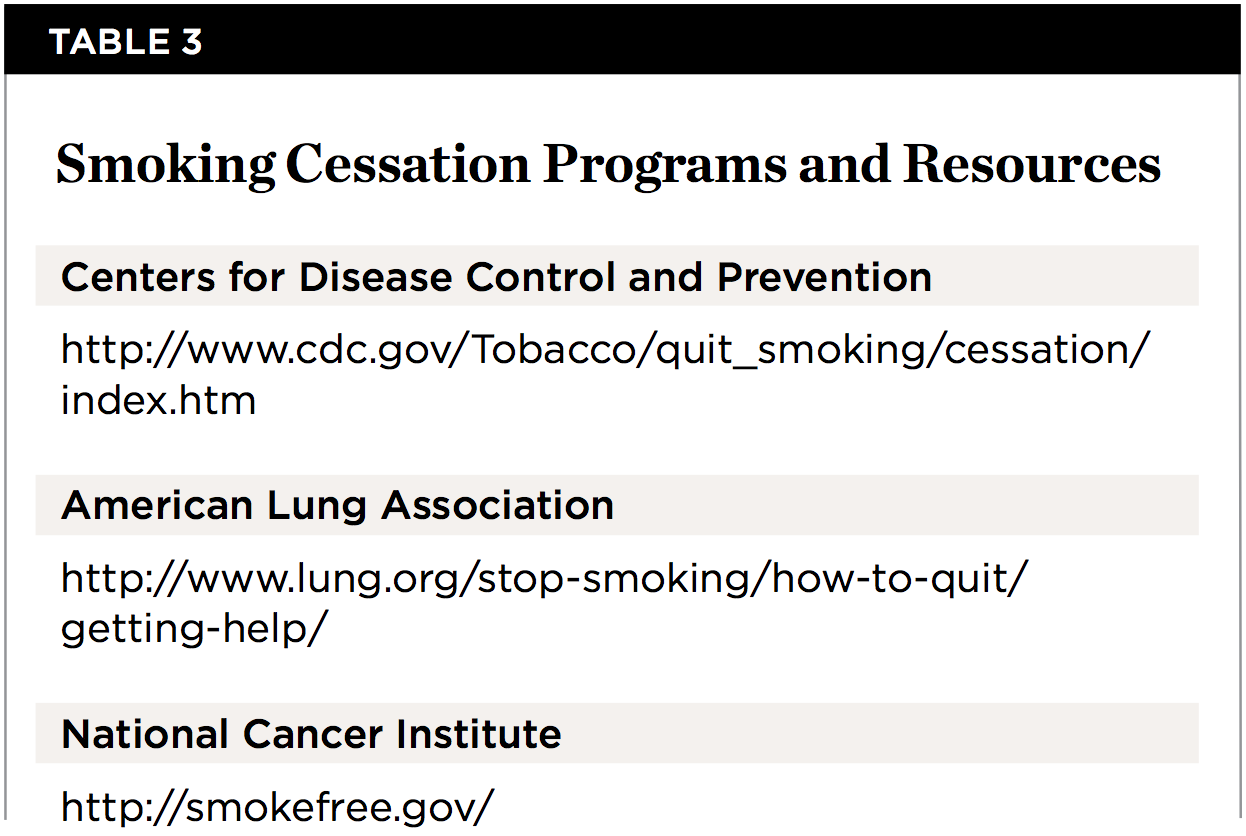 Smoking cessation is important for the preservation of the oral cavity and the patient’s overall health and well being. Most health history forms include a smoking-related question. The first step is to gather the data, including frequency and dose. It is the author’s opinion that this is only useful if it is incorporated into the patient’s treatment plan and risks for complications and therapy outcomes are shared and smoking cessation discussed. Dental professionals can choose to provide counseling in the office or refer patients for smoking-cessation treatment (Table 3).