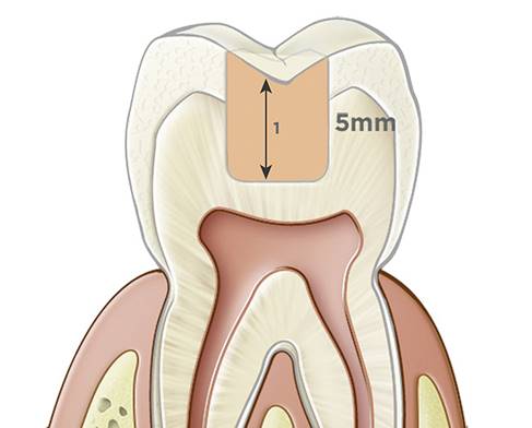 Bulk-fill composite materials are available today that can be placed in increments up to 4 mm or more (Figure 3), which is advantageous compared with 2-mm layering techniques, and cured in 10-second increments. For a shallow cavity up to 4-mm deep, light-cured dentin and enamel replacement bulk-fill composites can be placed in a single increment to replace both dentin and enamel.