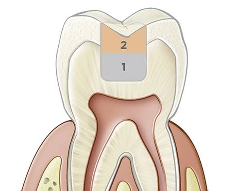 Because curing lights cannot always penetrate to the bottom of deeper preparations (eg, 8 mm), or the curing light may not be correct for the material used, dual-cured bulk-filled composites for replacing both enamel and dentin can be particularly beneficial. Clinicians can place the material in bulk from bottom to top in large defects, and the materials will self-cure to any depth possible with lower stress.12,14,15 However, achieving optimal bond strengths is predicated on using an adhesive bonding agent compatible with dual-cure resins.16