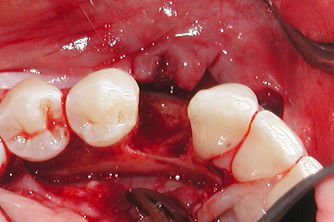 Because of the apparent bone loss, seen on the radiograph, on the mesial of tooth No. 21 and the distal of tooth No. 22, one suggestion was to remove teeth Nos. 21 and 22 and, subsequently, site-develop the regional anatomy for implant placement. The surface area requiring GBR was expected to be rather large, whereby autogenous bone grafting from the chin would have been elected to augment the site in both the horizontal and vertical dimensions. Following 6 months of healing, implant placement would ensue at either position, Nos. 21 or 23, to be restored as a bridge or at position Nos. 21 through 23 for individual implant restorations.