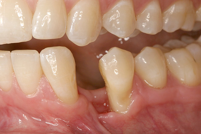 A 28-year-old Caucasian female presented to the periodontist with a complaint of a mobile implant in the site of tooth No. 22 (Figure 2 and Figure 3). The patient had a congenitally missing tooth No. 23. No. 22 had erupted into site No. 23, leaving a vacancy at site No. 22, and was the reason for the original implant at site No. 22.