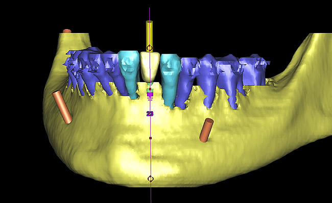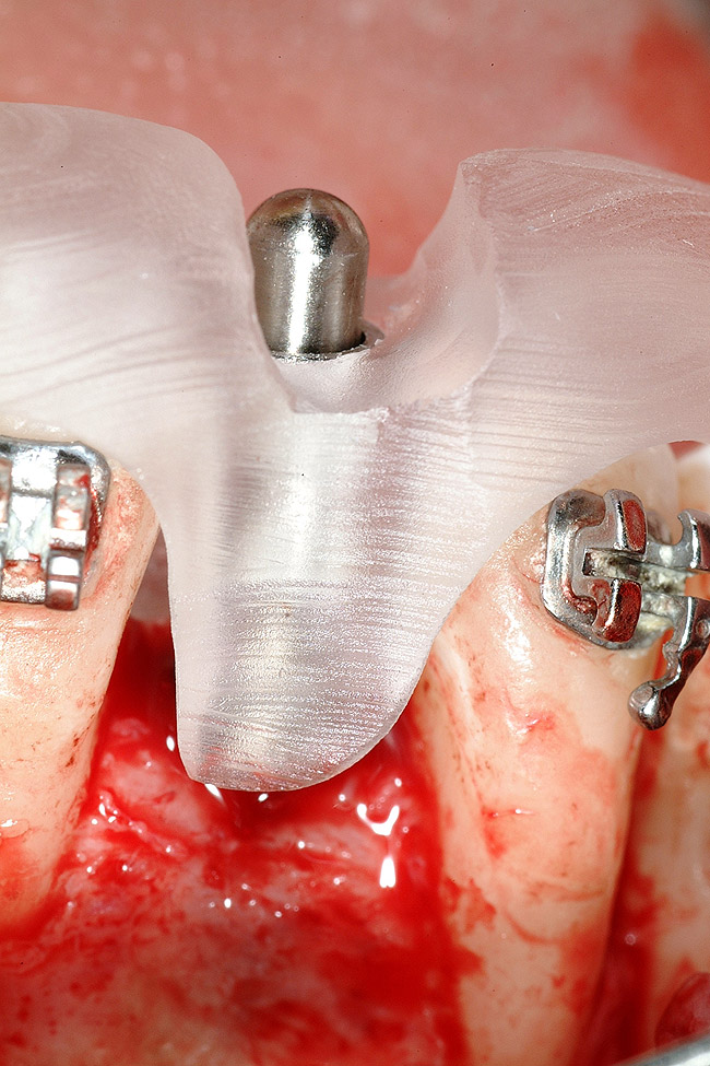 Following the first goal of orthodontia—moving tooth No. 22 to a proper functional and anatomical position—a periodontal reevaluation was performed, demonstrating an improvement in short- and long-term tooth prognosis. At this time, the decision was made to abort continual extrusion of teeth Nos. 21 and 22, although some attachment level discrepancy remained between Nos. 21 and 22 (Figure 14). Implant diagnostics ensued and included mounted study models and a diagnostic wax-up. A scanning appliance was created to demonstrate the desired prosthetic outcome requirements, and the patient was referred for computed tomography (CT) scans. CT scan assessment demonstrated successful orthodontically directed GBR to allow implant placement (Figure 15 and Figure 16). Only minor GBR therapy would be needed and could be accomplished simultaneously with implant installation. Guided implant placement occurred, using an open flap approach (Figure 17). During surgery, root dehiscences were noted on teeth Nos. 21, 22, 24, and 25, as well as the anticipated dehiscence following implant placement at No. 23 (Figure 18). A positioning reference (index) was secured after implant placement to facilitate a provisional prosthesis at stage II surgery. Cortical perforations then were placed adjacent to the implant to encourage angiogenesis (Figure 18), and mineralized freeze-dried bone allograft enhanced with platelet-derived growth factor was placed over the dehiscences for purposes of guided tissue regeneration and GBR (Figure 19). A highly resorbable collagen membrane was placed to stabilize the allograft. The flap was coronally repositioned, and primary-intention wound healing was achieved (Figure 20 and Figure 21). Following 4 months of stage I surgery, implant uncovery and immediate provisionalization were performed in conjunction with connective tissue grafting. Final orthodontic tooth movement then ensued, using the implant as anchorage to optimize end-tooth movements, interroot separation, and the cuspid-protected occlusal scheme. A final impression then was secured, and a zirconia abutment (Figure 22) with an all-ceramic restoration was fabricated for the prosthetic phase completion of No. 23 (Figure 23 through Figure 25).