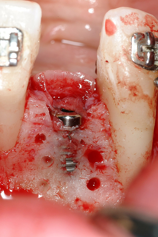 Distraction osteogenesis is a newer modality of guided bone regeneration (GBR) and has been used to help rebuild severe ridge defects.31 Orthodontics essentially is a form of distraction osteogenesis. Such therapy has been a longstanding modality of periodontal-orthodontic treatment to reduce or eliminate infrabony defects around teeth.32 Using distraction osteogenesis via tooth movement for GBR allows the clinician greater latitude in determining the size of the osseous defect to correct. Through tooth movement, the clinician can minimize the size and extent of the dentoalveolar ridge defect and have more predictable bone grafting. The smaller the defect, the more predictable the regenerative result will be.