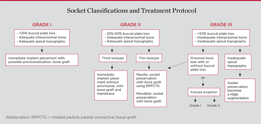 A unique classification and treatment protocol for the extraction sockets of single-rooted teeth to be replaced by implants has been presented. This classification is based on the amount and quality of the buccal plate present, the level of interproximal bone, and the apical topography. The presented treatment protocol takes into consideration the bone topography of the extraction socket, the biotype, and the socket location. The percentages for buccal-plate loss that serve to distinguish the socket groups and the listed cutoff points to characterize interproximal bone loss are suggestions. Each case a clinician encounters is unique, and this classification system serves to divide a spectrum of possibilities into distinct groups to aid in the selection of a treatment protocol.