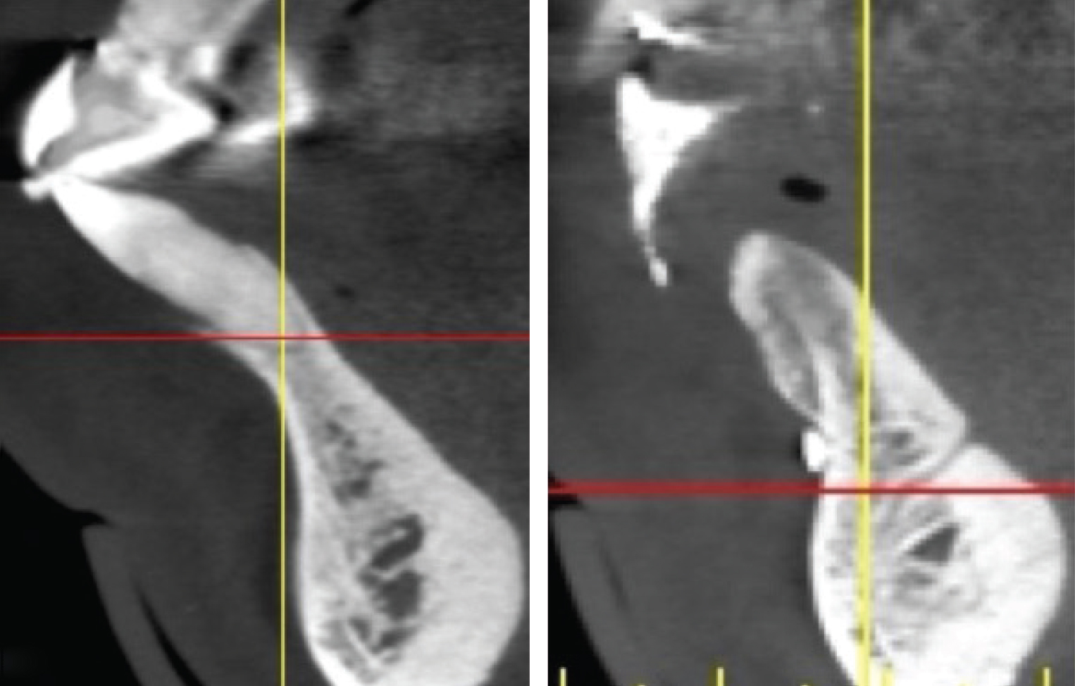 Grade III sockets are the most deficient and include any socket with inadequate apical topography, insufficient interproximal bone, or more than 50% loss of buccal plate. Inadequate apical topography is defined as not enough bone present apical to the extraction site to allow for implant placement and may be the result of bone loss caused by periapical lesions or concavities due to existing anatomy of the alveolus (Figure 4, right; Figure 5, right). Insufficient interproximal bone is defined as moderate-to-severe periodontal bone loss—greater than 2 mm on one or both of the adjacent teeth.