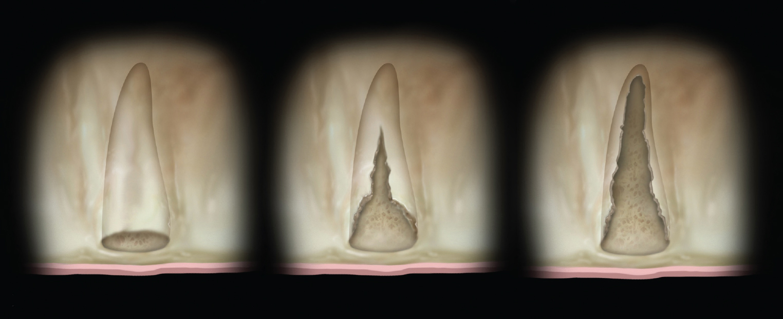 In this protocol, the principles observed in periodontal defect repair have been applied to extraction sockets. This is possible because of the similarities between sockets and periodontal defects: in both, the wound heals from the walls and continues to the center6; also, a completely intact socket is essentially a 4-wall defect within the alveolus, while a socket that is missing half of a buccal plate can be regarded as a three-and-a-half–wall defect, and one with no buccal plate can be considered a 3-wall defect. With periodontal defects, as the number and quality of bony walls decrease, so does the predictability of regeneration; therefore, each socket must be examined because the width of the defect, the number of walls, and the quality of the bone around it all impact the potential for regeneration.12-14 The authors have considered the variations in sockets that are possible following single-rooted tooth extraction and have divided these possibilities into 3 groups. The treatment protocol for each group considers the predictability of regeneration based on the principles of wound healing and tissue regeneration.