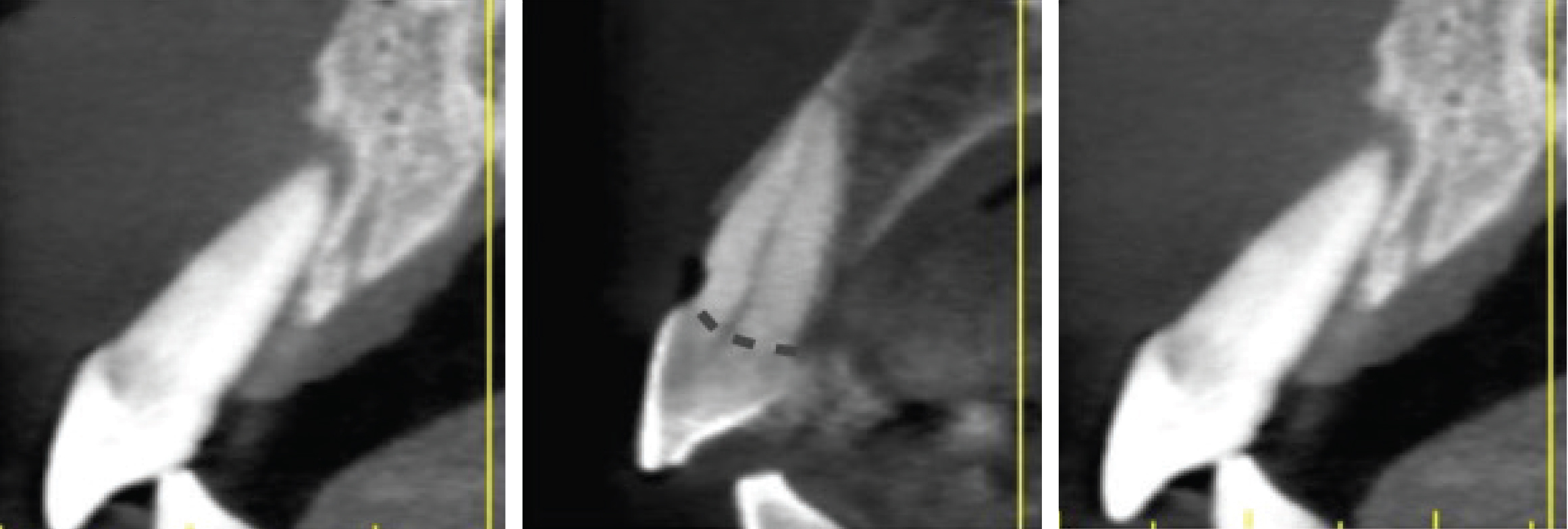Grade II sockets are differentiated from Grade I by the amount and quality of the remaining buccal plate. A Grade II socket has a fissure, dehiscence, or deficiency of the buccal plate totaling a 25% to 50% loss. Like Grade I sockets, they have adequate interproximal bone and apical topography (Figure 3, left; Figure 4, center; Figure 5, center).