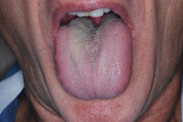 With reduced salivary flow, the mucosa can appear dry and even adhere to examination gloves, gauze, or mouth mirror. The lingual dorsum may exhibit fissures and elongation of the filiform papillae, often described as a coated or hairy tongue (Figure 1). Dental caries may be present, especially in the cervical areas or root caries (Figure 2). Small erythematous macules on the buccal mucosa represent bite marks, which are common with inadequate saliva (Figure 3). Gingivitis (Figure 4), gingival recession, and periodontal disease may be present.14,15