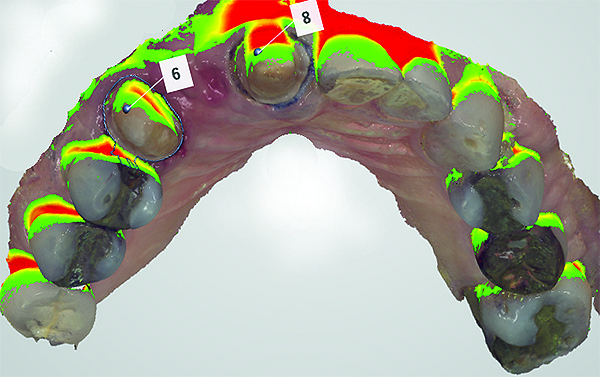 (6.) Examination of the optical impression for undercuts. Note the presence of undercuts (red) labially on the central incisor and mesially on the canine.