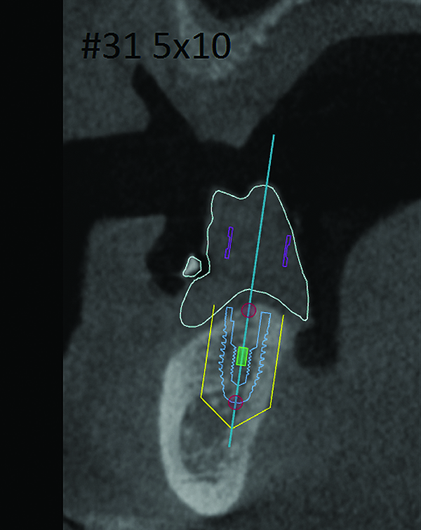 3D radiographic files (CT, CBCT) are stored digitally using a standardized digital imaging and communication in medicine (DICOM) format. In combination with a radiographic guide fabricated from a diagnostic wax-up, CBCT can be used to plan implant location and angulation based on prosthetically driven parameters and local bone/tissue constraints (Figure 8 through Figure 11). Currently, there are two different protocols to incorporate the radiographic guide in 3D scans and to perform computer guided surgery. The first is the double scan protocol, in which the patient wearing the radiographic guide and the radiographic guide alone are scanned separately. Fiduciary markers incorporated in the radiographic guide allow for matching of the two scans. This protocol allows for digitization of the surgical guide with great accuracy, irrespective of errors introduced by patient scans.18 Specialized software can be used to create a surgical guide (Figure 12).
