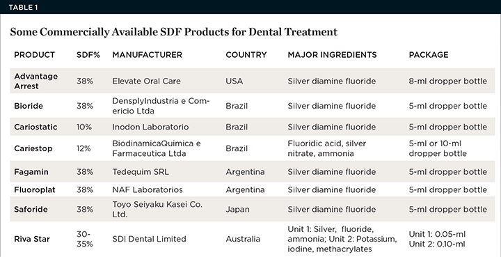 Two different chemical forms are available for silver and fluoride combination: silver fluoride and SDF. Silver fluoride at 40% was used in western Australia to arrest dental caries in children.12 SDF contains ammonia and silver fluoride; the ammonia ions combine with silver ions to produce a complex ion called the diamine-silver ion, and this complex is more stable than silver fluoride. Thus, it is also called diamine silver fluoride. SDF is claimed to be more stable than silver fluoride, and it can be kept in constant concentration for a period of time.13 While silver fluoride is becoming less readily available in dentistry, SDF is commonly used in 38% solution for treatment of hypersensitivity and caries control. Some commercially available SDF products are listed in Table 1.