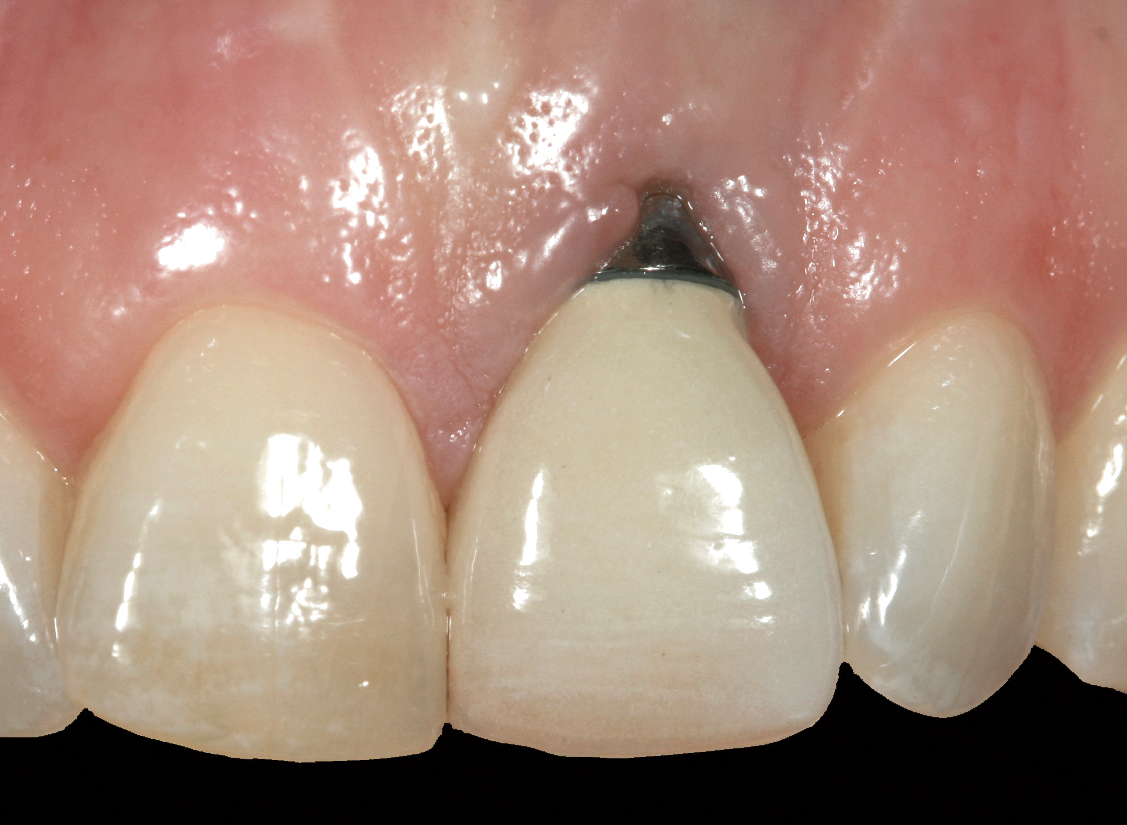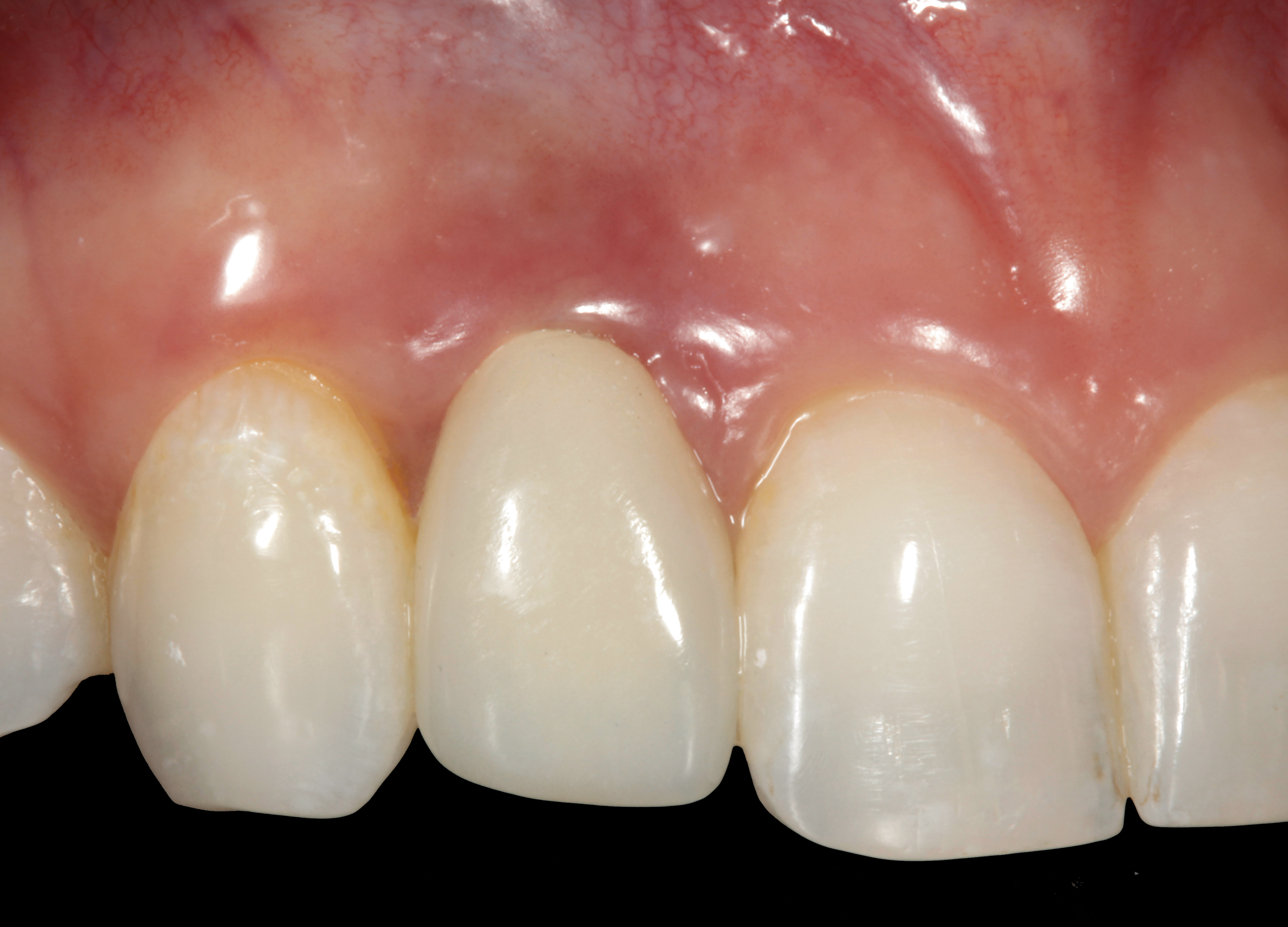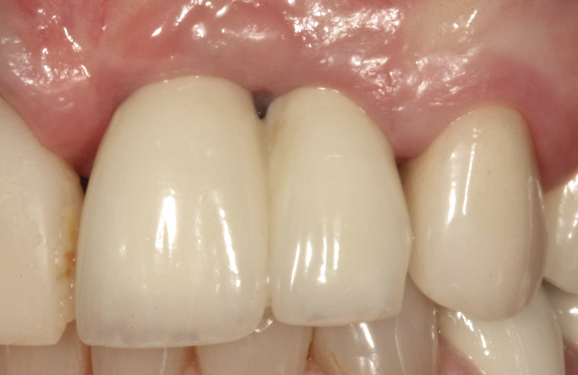 It was determined that additional augmentation was required to increase the soft-tissue volume, so a subepithelial connective tissue graft was acquired from the palate (Figure 8),23,24 placed, and allowed to mature for at least 3 months. Second-stage implant undercovering surgery with a palatal-biased incision was performed after tissue maturation to further thicken the labial soft tissues. In addition, a flat contoured healing abutment was placed to allow the soft tissues to mature without risk of recession, and the RBR replaced (Figure 9). After 4 to 6 weeks of healing, a flat contoured screw-retained provisional restoration was inserted (Figure 10) with the proper submergence profile to restoratively sculpt the soft tissues. An implant-level impression was made and the definitive cement-retained metal-ceramic restoration fabricated and inserted (Figure 11 through Figure 13). The final esthetic outcome to restore the proper length and proportion of the right lateral incisor to match that of the contralateral incisor was accomplished using the treatment steps outlined above, where the mucosal tissues were augmented after implant decoronation (Figure 14).