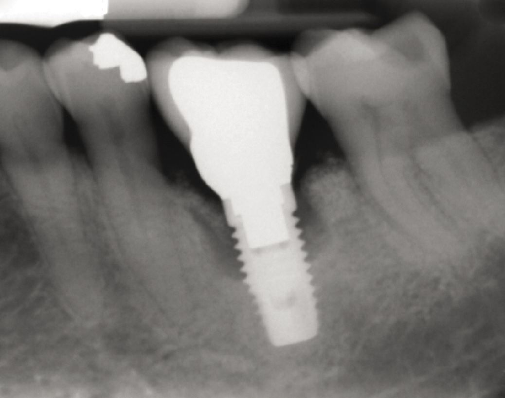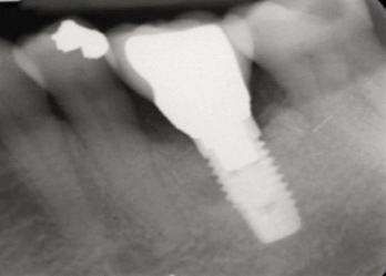 The following case report provides an example of this case scenario: A 55-year-old Caucasian female presented with a chief complaint of tenderness of 1-week duration around a single implant-supported crown in tooth No. 19 position; the implant and restoration had been placed approximately 2 years prior.