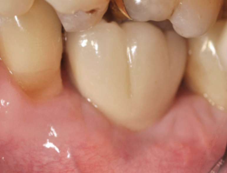 Problem: The implant is placed too facially, and there is significant labial gingival recession, contour change, and mucosal discoloration around the implant, abutment, and crown (Figure 3 and Figure 4). The implant attachment apparatus is intact and healthy, but the patient has a thin periodontal phenotype.