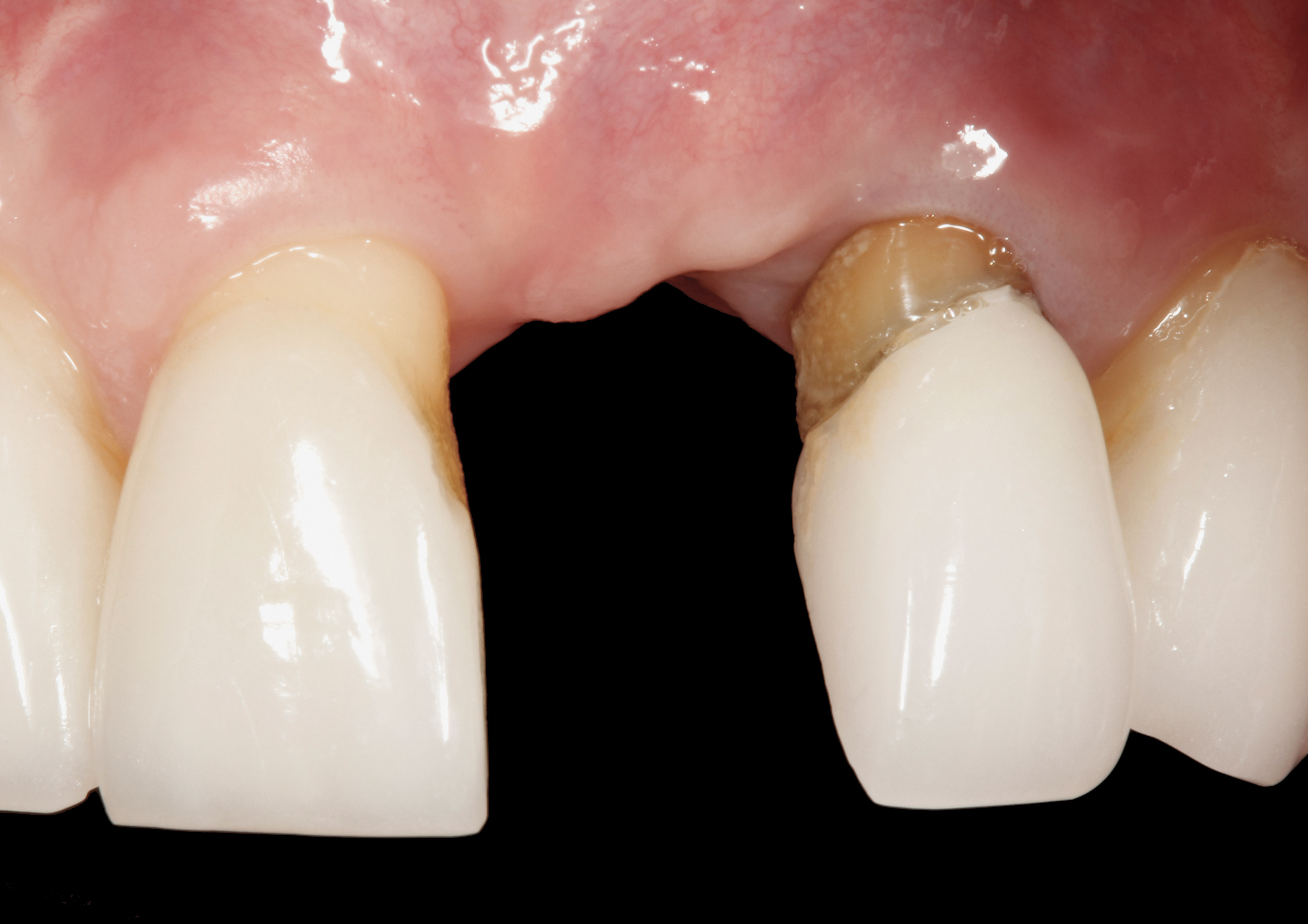 Solution: (1) Remove the implant and wait for soft-tissue maturation. (2) Perform forced eruption of the tooth with the lost interproximal attachment (ie, papilla) to the level of the adjacent healthy papilla. (3) Rebuild the hard and soft tissues, and replace the implant in the edentulous site. Augmentation can be performed either in conjunction with implant placement or separately based upon the clinician’s judgment and discretion. (4) After healing, provisional and definitive restoration can be managed as per prior clinical scenarios.9