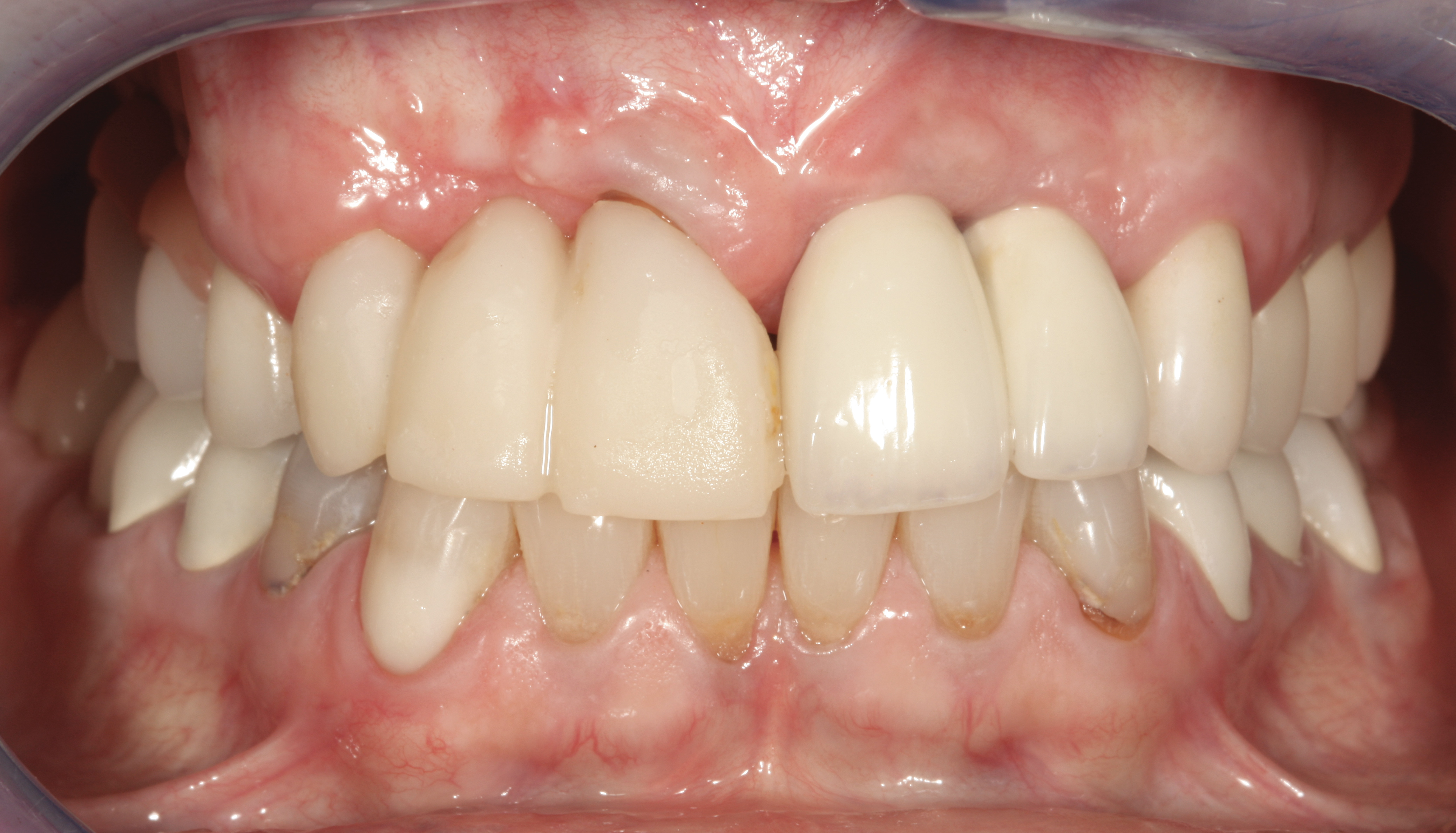 Problem: Two adjacent implants are located in the central–lateral incisor positions, and the patient has a high smile line along with loss of inter-implant papilla and midfacial recession around both implants (Figure 29 and Figure 30).33-38