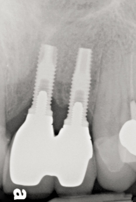 Solution: Save the implant by treating the peri-implantitis defect with a surgical therapy protocol, ie, open flap debridement, detoxification, and bone grafting. Show the patient how to clean and maintain the residual tissues.