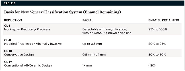 The concept of no-preparation or minimal-preparation veneers is more than 25 years old, yet there is no classification system categorizing the extent of preparation for different veneer treatments.2 Such a system could be indicated in various clinical scenarios and benefit dentists and patients, guiding conservative veneer preparation and placement.2