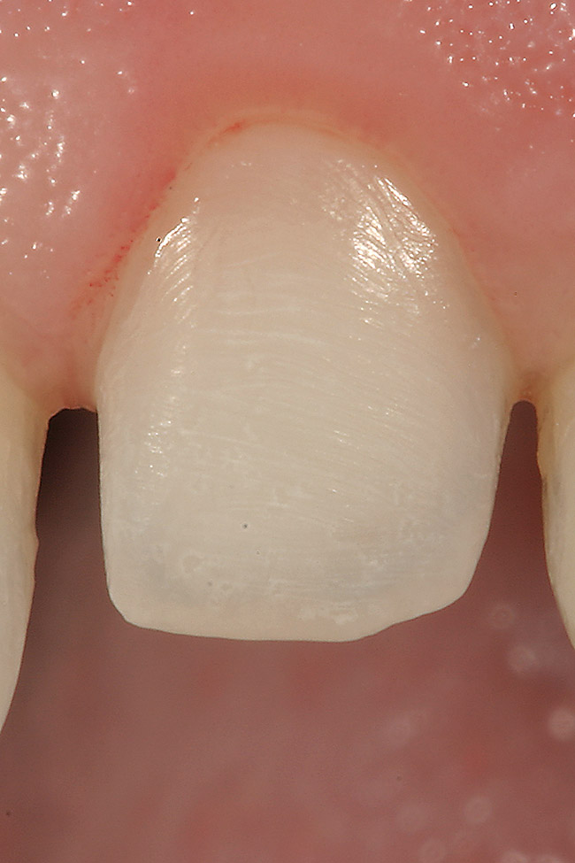 Before considering available smile-enhancing options, patients should undergo comprehensive clinical examinations, including an esthetic evaluation.14 Interdisciplinary modalities must include the following: perio-plastics, tooth bleaching, direct composite veneers, and porcelain veneers, which are options providing predictability and longevity in carefully selected esthetic cases.14 Before considering and undertaking restorative options, orthodontics should always be considered. Orthodontic treatment is a non-invasive modality for achieving desired results and/or ensuring teeth are properly positioned for long-term predictable function and esthetics. Subsequent restorative treatment using minimally invasive or no-preparation porcelain veneers can then be considered, since long-term research shows a 93% to 94% survival rate for this conservative treatment.14,15