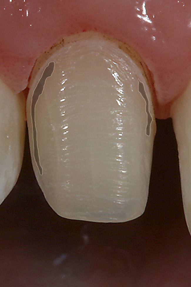 When preparations fall outside these parameters (Figure 15), a crown should be considered for predictability and longevity. It is well established that when a tooth has greater than 50% of enamel missing (Figure 16), moderate sclerotic dentin, and greater than 3 mm of unsupported porcelain, a crown must be considered. Magne found that 65% of a tooth’s integrity comes from the cingulum and approximately 27% from lingual marginal ridges.55 These anatomical landmarks must be preserved at all costs.55 No significant differences in crown flexure were found between natural and veneered incisors when the cingulum is presevered.56