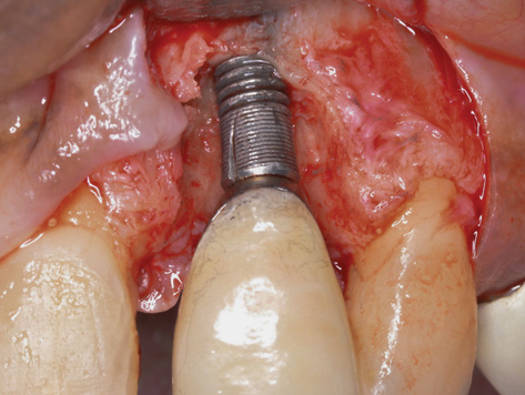It is important to point out that not all implants presenting with mucogingival or esthetic complications require explantation, especially when the affected implants are partially supporting a multiple-unit restoration. This can be demonstrated in the following case. Implants were placed almost 20 years prior to the patient presenting with advanced soft-tissue recession on the maxillary right arch (Figure 15). There was a lack of keratinized/attached mucosa and buccal bone deficiency. This bone deficiency was not pathologic, but the result of physiologic remodeling,6 which was evident following flap reflection (Figure 16). At the time that these implants were placed, simultaneous bone augmentation to offset the diminution of the arch after tooth extractions was not a prerequisite.7 Also, the importance of soft-tissue augmentation at the time of immediate implant placement was not fully appreciated when this patient was originally treated.8,9 Formation of biologic width combined with a thin periodontal biotype often results in significant crestal bone loss.10 More recently, the importance of increasing soft-tissue thickness as it relates to more favorable crestal bone preservation has been demonstrated by Linkevicius and colleagues.11 Removing these implants would commit the patient to remaking her large prosthesis; therefore, she was interested in maintaining them with a corrective mucogingival procedure.