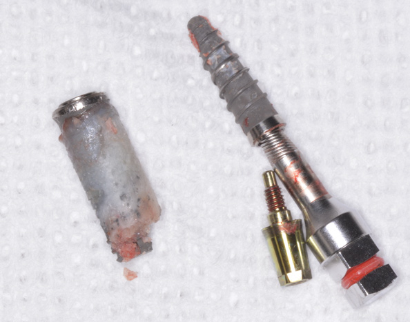 When dental implants fracture, they typically require removal. Implant fracture can lead to abutment instability and screw loosening, which may result in inflammation and infection as subgingival bacteria colonize normally inaccessible regions. This can lead to marginal and buccal/facial bone loss associated with the location of the fracture. When the coronal aspect of a restored implant fractures, it can cause mobility of the abutment and cemented restoration (Figure 1). In addition, multiple try-ins of ill-fitting restorations and torqueing of abutment screws can fracture an implant (Figure 2). Bone loss, swelling, and discomfort persisted after localized debridement and systemic antibiotic therapy; therefore, this implant was eventually removed.