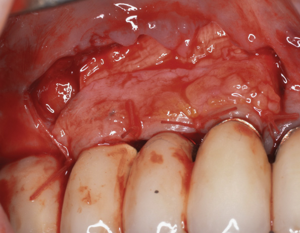 Due the loss of crestal bone in 360 degrees around these implant platforms, it is unrealistic to anticipate complete coverage of the implant abutments and collars.12 This procedure arrested the progress of recession, regenerated some of the lost facial bone, and increased the zone of keratinized mucosa.