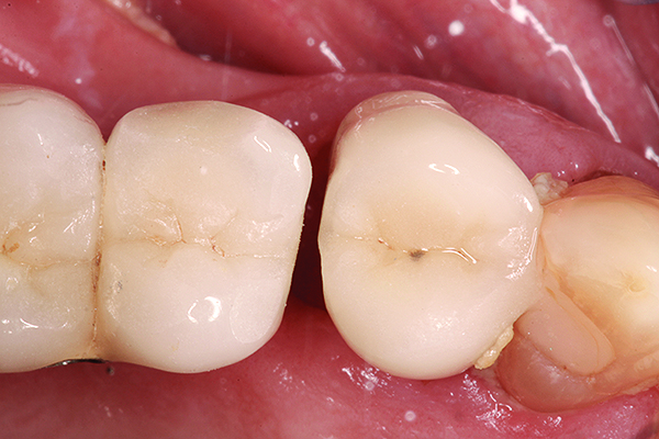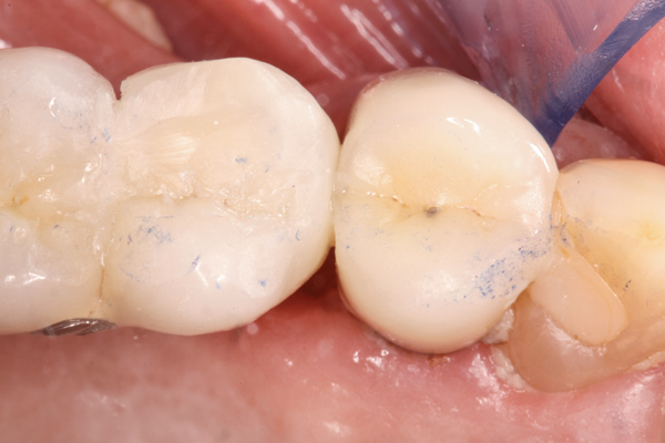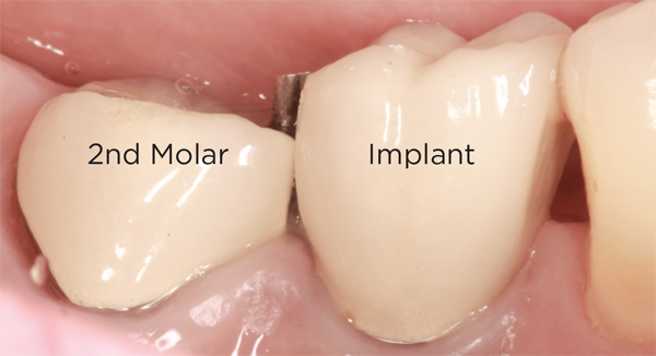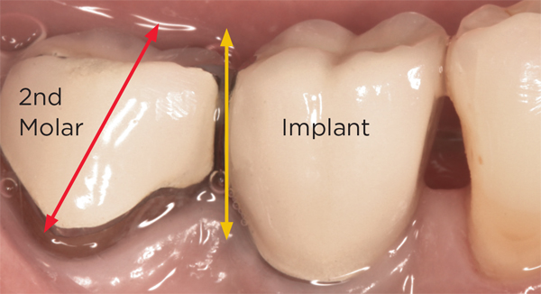 In a mixed teeth and implant dentition, horizontal growth and/or mesial drift of teeth can lead to posterior open interproximal contacts (Figure 1). The open contact can be corrected and closed by modifying the existing restoration with chairside bonding as long as the implant restoration can be easily retrieved (Figure 2). This can be accomplished in one visit (Figure 3), or porcelain can be added to the implant restoration in the laboratory. Easy, predictable retrievability is key to future serviceability of any implant restoration. Screw retention is a more predictable option than cement, as cement-retained restorations may not always be retrievable depending on the retention and the type of cement used.6