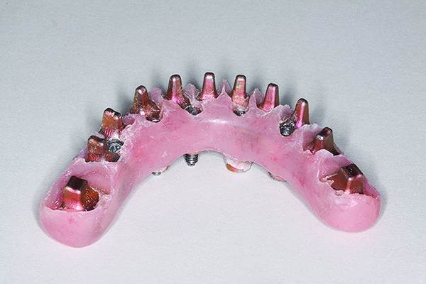 The benefits of cross-arch stabilization have been described above. The drawback of any one-piece design is the difficulty in repairing any such restoration. This can be avoided by having a full-arch framework that supports removable screw-retained PFM segments (Figure 13 and Figure 14) or individually CAD/CAM-milled cemented crowns (Figure 15 through Figure 18). This combines the strengths of a one-piece restoration with easier maintenance.