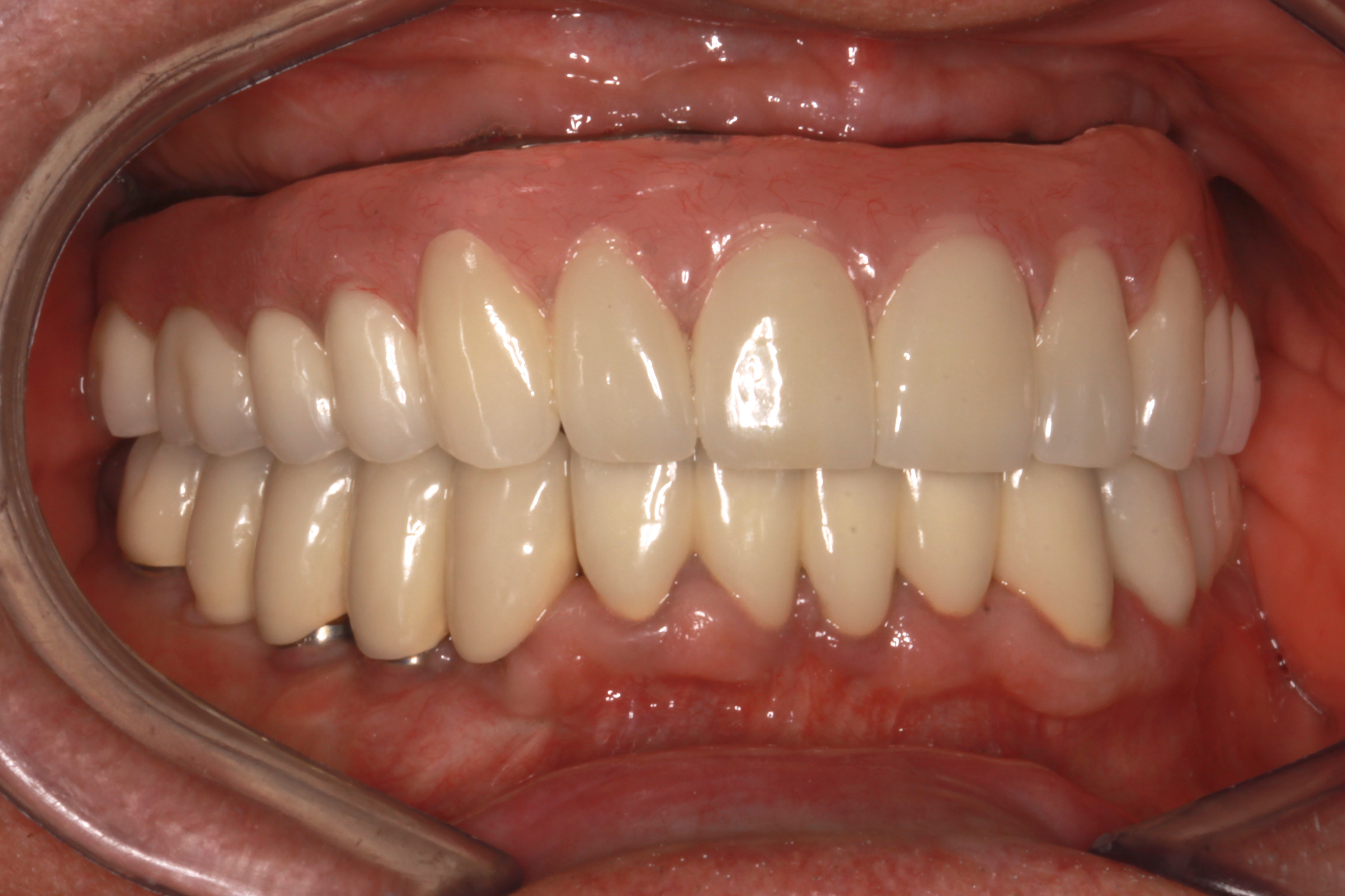 With this approach the occlusal load is shared among all teeth or implants in the arch. This reduces eccentric forces on an individual implant no matter how the implant is angled or positioned relative to the occlusal surfaces. In a full-arch restoration it allows occlusal contacts to be placed where they need to be. Forces that would be of axis for an individual implant are no longer focused on one implant. Cross-arch stabilization, however, does not replace careful management of occlusal forces, including reducing the angle of incisal guidance and, thus, lateral eccentric forces.