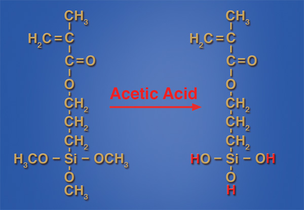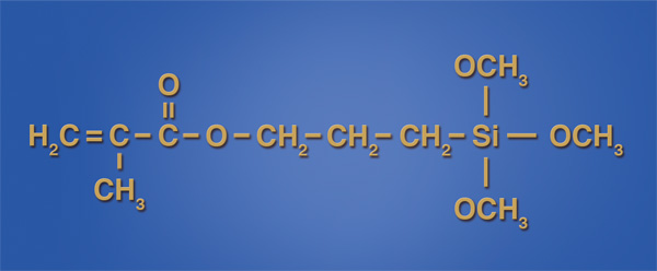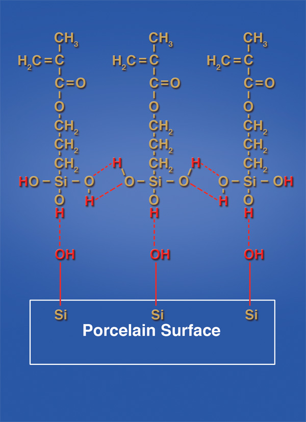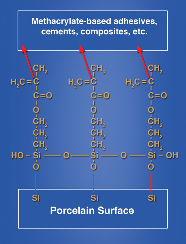 Some universal adhesives also claim they can be used in lieu of dedicated silane coupling agents when bonding to silica-based ceramics (feldspathic, lithium disilicate, etc.). Historically, the use of hydrofluoric acid (HF) followed by the application of a dedicated silane coupling agent has been the treatment of choice in this regard, and the author has previously discussed this topic in great detail.74 Silanes are a class of organic molecules that contain one or more silicon atoms. Dozens of different silane compounds exist and are used extensively in industry and manufacturing. The silane typically used in dentistry, for both intraoral repair and the priming of silica-based ceramic restorations prior to placement, is 3-methacryloxypropyltrimethoxysilane (Figure 13 through Figure 16). The manufacturers of some universal adhesives have incorporated silane directly into their adhesive formulations, as noted in Table 1, with the idea that the universal adhesive can now be used instead of a separately applied dedicated silane solution. This makes sense as long as all the other chemistry found in universal adhesives does not interfere with silane stability and performance. The manufacturers of other universal adhesives have chosen not to add silane into their formulations because they question the stability of silane in the acidic environment of a universal adhesive and/or believe the chemical interaction of silane with silica-based ceramics is significantly inhibited when combined with all the other monomers found in universal adhesives. Indeed, contact angle studies have found that the incorporation of bis-GMA resin or MDP (both of which are used in universal adhesives) into silane solutions substantially reduced the priming efficiency and chemical interaction of the silane with silica-based lithium disilicate compared to pure silane controls.75,76 Once again, in the author’s opinion, the efficacy and wisdom of incorporating silane into universal adhesives is an area that requires further study and clarification. When bonding to silicate-based ceramics, the author’s personal preference, at least at this time, is to etch the porcelain with HF followed by the use of a dedicated pre-hydrolyzed silane primer (eg, RelyX™ Ceramic Primer, 3M ESPE; Porcelain Primer, Bisco, Inc.; Ultradent® Silane, Ultradent Products, Inc.) that is free of any added monomers or resins (pure silane).