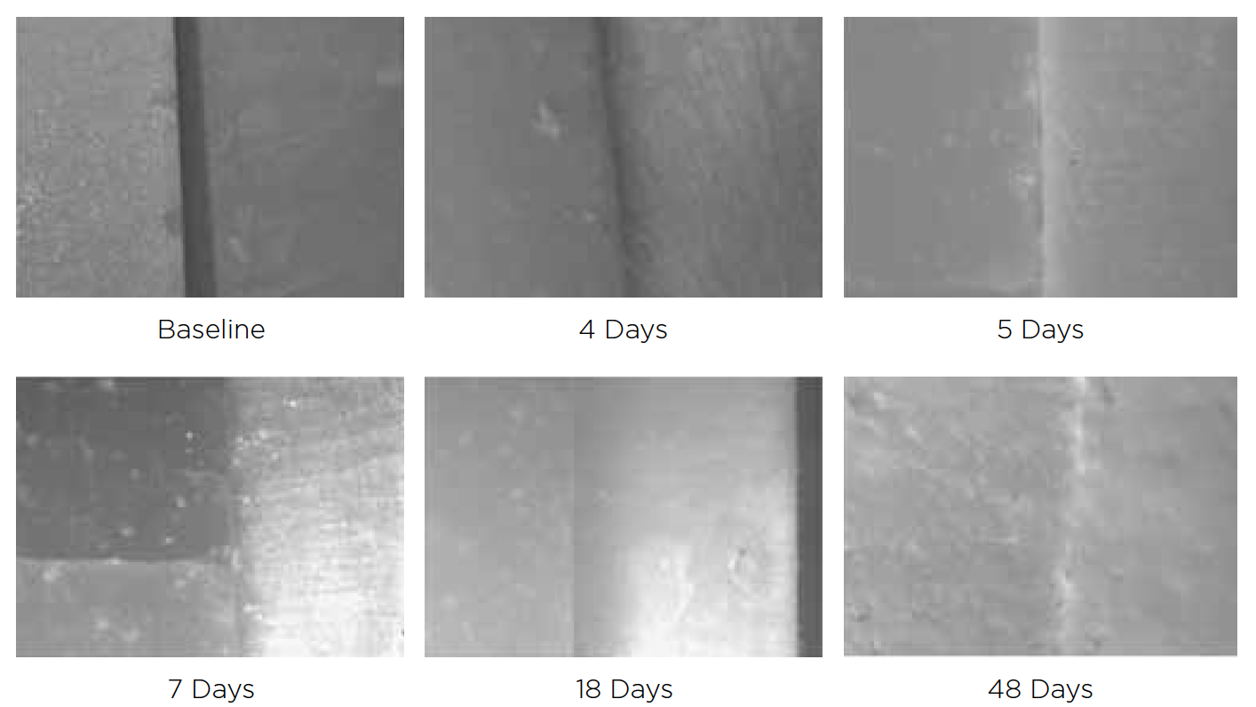 Recently, clinicians have begun questioning whether or not bioactive dental cements are able to seal marginal gaps. The results of a preliminary investigation in 2015 were encouraging.5 The researchers found no evidence of marginal gap occlusion for three conventional cements that were evaluated under simulated aqueous physiologic conditions. However, the two bioactive surface apatite-forming cements that were studied did appear to seal or reseal the artificial marginal gaps (Figure 2), suggesting a new functional property for bioactive dental materials. The researchers noted that the ability to significantly and predictably improve marginal stability could enhance the survival and serviceability of dental restorations. Figures 3 through 8 illustrate the use of a bioceramic cement to secure a single maxillary lithium disilicate crown.