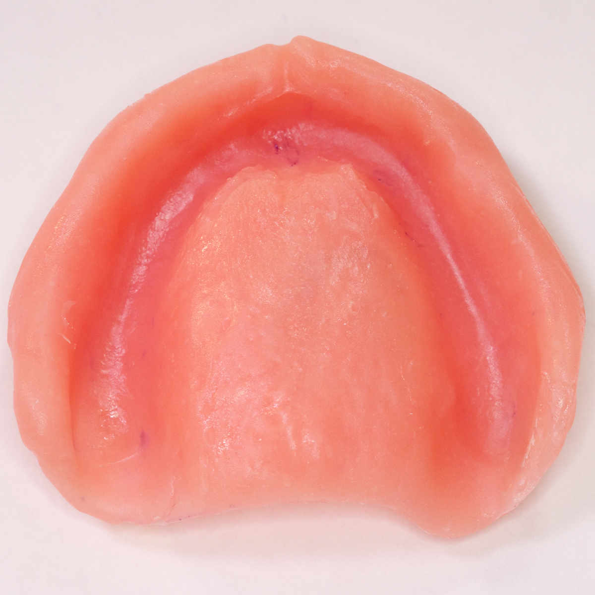 Tongue position is important to maintain stability of the lower denture and develop the proper length of the lingual flange.23 Tongue positions may be classified as “normal” or “retracted” (Figure 12).23 A normally positioned tongue completely fills the floor of the mouth. The lateral borders rest over the posterior edentulous ridges, where they would normally rest over the occlusal surface of the posterior teeth, and the tip of the tongue rests on or is just lingual to the anterior ridge crest. This tongue position maintains the correct position of the floor of the mouth. Retracted tongue posture is demonstrated when the tongue is pulled back, exposing the floor of the mouth, and the lateral borders are either medial to or posterior to the edentulous ridge. In addition, the tip of the tongue is located in the posterior portion of the mouth or is withdrawn into the body of the tongue itself. Approximately 35% of patients present with retracted tongue posture.23 The prognosis of patients with a retracted tongue can be improved by making them aware of their condition and instructing them to position the tongue correctly during rest and function. Prescribing tongue exercises23 and placing a training bead of resin on the lingual aspect of the denture in between the central incisors24 can also help retrain the tongue and maintain its proper position (Figure 13 and Figure 14).