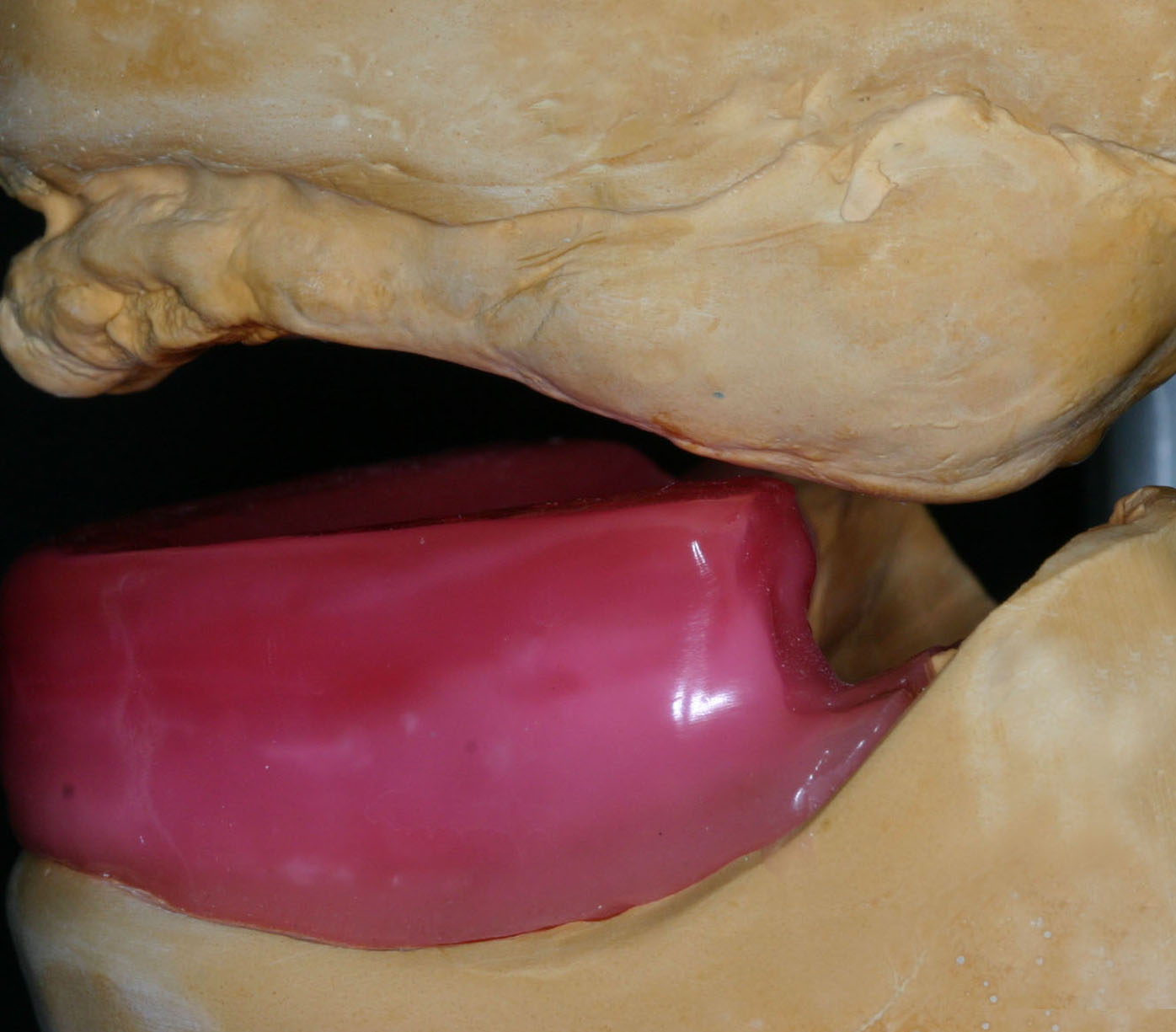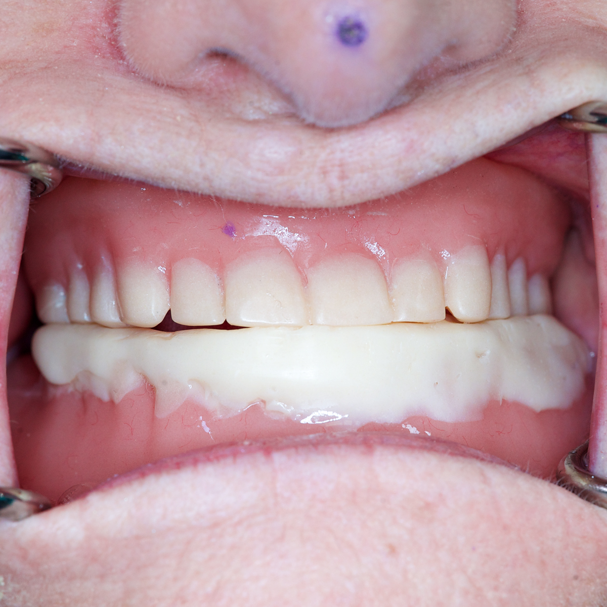 Residual ridge resorption and wear of the prosthetic teeth are noted to be the two major causative factors for lost vertical dimension of occlusion (VDO) in complete denture wearers.1,5-7 A reduced VDO may result in poorly conditioned tissues that are incapable of providing adequate support to the prosthesis. Other possible results of a reduced VDO include reduction of lower face height, compromised facial esthetics, an acquired Class III maxillomandibular relationship, angular cheilitis, and temporomandibular joint (TMJ) sounds on auscultation.8 Habitual mandibular posturing and altered neuromuscular programming in patients presenting with an insufficient VDO may cause difficulty in registering an accurate maxillomandibular relationship (Figure 1).9 Therefore, it is extremely important to reestablish an esthetically appropriate and functional VDO prior to the definitive therapy.9 Patients with a collapsed VDO may need to be reprogramed with an orthopedic device (which can maintain the mandible at an increased VDO) so that they can adapt to a new jaw separation position.1,9 It is important to improve the fit of the existing dentures and the health of the intraoral tissues before fabrication of the orthopedic device. A tissue conditioning material can be used to help restore the health of the denture bearing tissues (Figure 2).10
