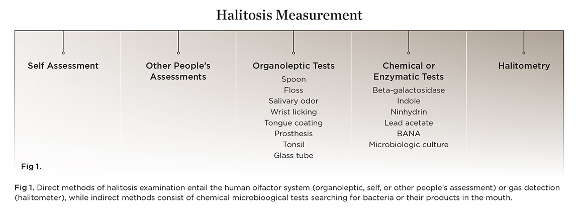 Halitosis is chronic, endogenous malador that is etiologically classified from type 0 to 5—physiologic, oral, airway, gastroesophageal, bloodborne, and subjective, respectively.1 Halitosis measurement methods should cover each of the three malodor sources: the mouth, nose cavity, and breath.