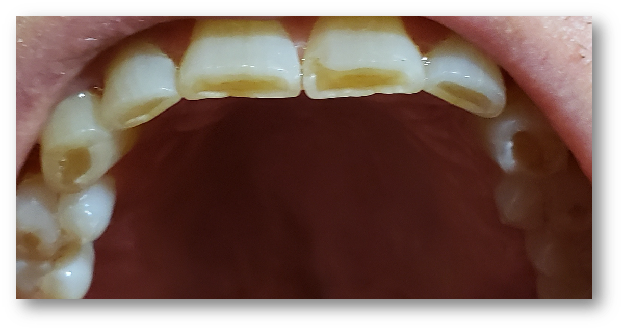 Tooth erosion from GERD occurs as a result of exposure of the teeth to hydrochloric acid from the stomach. This erosion, in conjunction with abrasive factors such as tooth wear, mastication, toothbrushing, etc, typically manifests as ditching or cupping of teeth on the incisal edges and lingual surfaces of the maxillary anterior teeth and the cusps of the occlusal surfaces of both maxillary and mandibular posterior teeth. This "ditching" effect is different than a patient ingesting large quantities of carbonated beverages, which typically results as erosion of the labial or facial surfaces of the anterior teeth (Figure 7). The lesions caused by GERD are hard to the touch with an explorer instrument, as opposed to decay.14