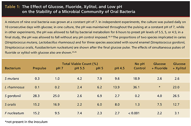- Inhibition of plaque acid production, eg, by fluoride containing products or other metabolic inhibitors such as xylitol. Fluoride not only improves enamel chemistry but also inhibits several key enzymes, especially those involved in glycolysis and in maintaining intracellular pH.24 Fluoride and xylitol can reduce the pH fall following sugar metabolism, and in so doing, prevent the establishment of conditions that favor growth of acid tolerating cariogenic species25,26 (Table 1). Xylitol can interfere with sugar transport in mutans streptococci, and therefore cannot be metabolized to acid nor generate a low pH in plaque.