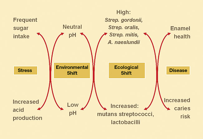 Understanding the role of microorganisms in dental caries requires a paradigm shift away from concepts that have evolved from studies of classical medical infections with a simple and specific (eg, single species) etiology to an appreciation of ecologic principles. The development of plaquemediated disease at a site may be a breakdown of the homeostatic mechanisms that normally maintain a beneficial relationship between the resident oral microflora and the host. When assessing treatment options, an appreciation of the ecology of the oral cavity will enable the enlightened clinician to take a more holistic approach and consider the nutrition, physiology, host defenses and general well-being of the patient, as these will affect the balance and activity of the resident oral microflora. Future episodes of disease will occur unless the cause of any breakdown in homeostasis is recognized and remedied. For example, a side effect of many medications is a reduction in saliva flow. This reduction can affect glucose clearance and buffering adversely, thereby favoring the growth of acid-tolerating and potentially cariogenic bacteria. Identification of such biochemical choke points may lead to the selection of appropriate caries preventive strategies that are tailored to the needs of individual patients. In this way, the clinician would not only treat the results of the caries process but also attempt to identify and interfere with the factors that, if left alone, will inevitably lead to additional disease.