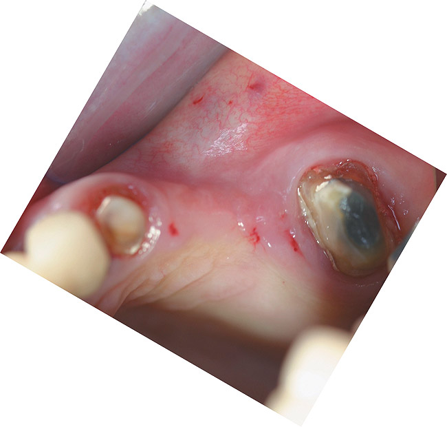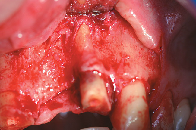 Figure 1  Full-thickness flap reflection exposed the left lateral incisor, which was fractured and intruded apically beyond the alveolar housing.