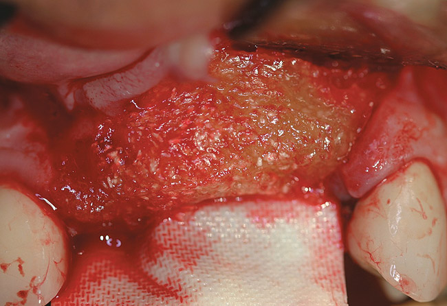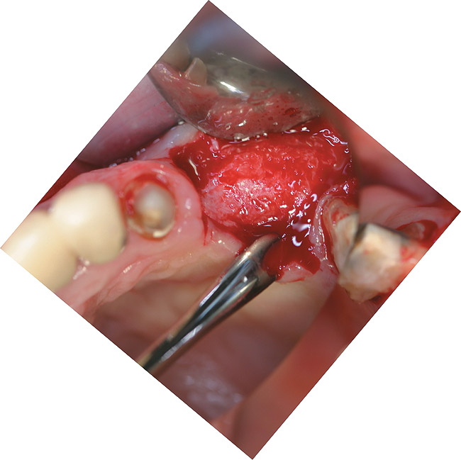 Reflection of a full-thickness flap revealed complete loss of the facial plate (Figure 12). Approximately 1 cm3 of RegenerOss Allograft Putty was expressed into the defect and molded (Figure 13), then covered with an Ossix Plus membrane (Figure 14). Extensive periosteal-releasing incisions were used in conjunction with mesial- and distal-releasing incisions to obtain passive primary closure.