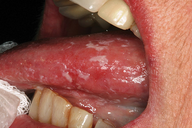 Saliva aids for oral cavity cleansing, swallowing, taste, speech, and digestion could be compromised in patients with salivary gland hypofunction. The oral mucosa may appear dry and friable. The tongue may appear dry and fissured (Figure 1). Dental caries, plaque accumulation, gingivitis, and periodontitis are common in patients with significant salivary gland hypofunction (Figure 2). Infections, such as oral candidiasis (Figure 3), and enlargement of salivary glands from sialadenitis are seen commonly in patients with moderate-to-severe salivary gland hypofunction (Figure 4). Difficulty in mastication and swallowing also may indicate advanced salivary gland hypofunction19 and can contribute to poor nutrition.20 Denture retention may become difficult because of the lack of saliva12 (Table 3).