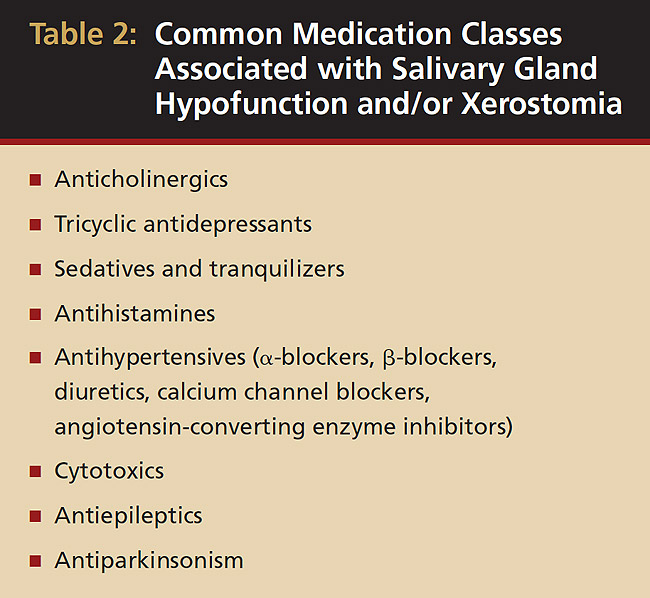 Aging per se has no significant impact on salivary gland secretion.12 In the elderly, several factors, such as decrease of ptyalin, increase of mucin, and low stimulation of the peripheral receptors, have been implicated in xerostomia.13 Xerostomia and/or salivary gland hypofunction in this population has been associated with a number of systemic disorders (Table 1) and medications14,15 (Table 2). The incidence increases with medication exposure,16 with more than 400 drugs implicated.2 In a 5-year longitudinal study, the relationship of dry mouth and long-term exposure to medications was assessed. Xerostomia severity was found to be higher among females and associated with the use of medications, such as antianginal, diuretics, antidepressants, and antiasthma, as well as thyroxine.17 Xerostomia and salivary gland hypofunction are also major complications of radiation or chemotherapy. Long-term morbidity in patients receiving combined radiation and chemotherapy is significant because of xerostomia, salivary gland hypofunction, and severe dysphagia.18