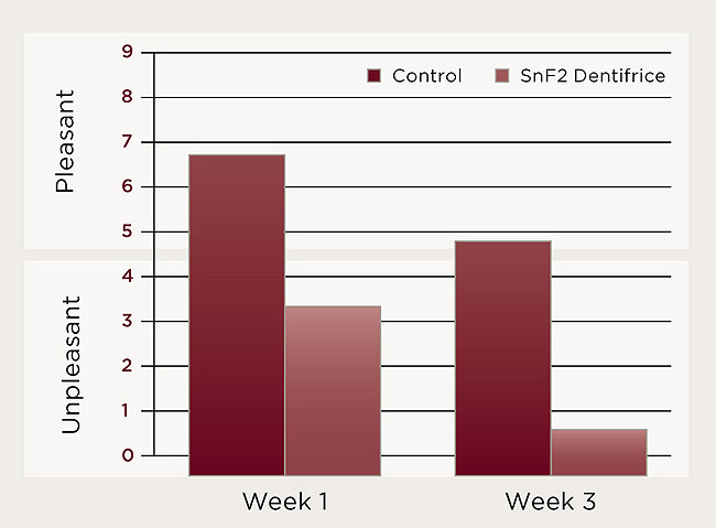Triclosan is an antibacterial agent commonly found in many anti-acne products, hand soaps, and detergents. For many years, triclosan has been included in the toothpaste formulations to enhance inhibitory effects on bacterial metabolism in dental plaque. Numerous studies have confirmed these effects by showing a reduction in the accumulation of dental plaque, gingivitis, and calculus. One study revealed brushing twice a day with a triclosan toothpaste with or without tongue scraping significantly reduced the amount of bad breath caused bacteria.22 The triclosan-containing toothpaste was compared against the control, a standard sodium fluoride toothpaste. Using a Halimeter® (Interscan, www.halimeter.com) to measure the VSC concentrations, a reduction by more than 20 ppb was observed when measurements were taken at 3, 24, and 27 hours for 2 days.22 After using the triclosan toothpaste, participants reported in a questionnaire that their mouths overall felt “fresh and clean.” This demonstrates a simple regimen coupled with a triclosan-containing product can have profound effects against bad breath. Conversely, triclosan, essential oils, and cetylpyridinium chloride are still less effective in comparison to chlorhexidine for short-term management of oral malodor.23 The effectiveness of active ingredients in oral healthcare products depends on their concentration, in which excessively high concentrations can leave unpleasant side effects. Triclosan is not as potent as many other dentrifice compounds but nonetheless has anti-gingivitis and anti-plaque properties when used with other products that may contain stannous fluoride, chlorhexidine, essential oils, cetylpyridinium chloride, etc.24 Clinical studies have suggested the continued use of dentifrices and mouthwashes containing triclosan because these products amplify the effects of mechanical brushing and flossing to combat bad breath caused by bacteria.2 Other recent studies have shown the effectiveness of stannous fluoride in toothpastes for combating oral malodor.26 As a chemotherapeutic agent, stannous fluoride has wide-spectrum antimicrobial properties against both gram-positive and gram-negative species. Numerous clinical trials have demonstrated how well stannous fluoride acts against caries, plaque, gingivitis, and bad breath. These benefits are because of the multifaceted mechanisms of the stannous ion, from the alteration of bacterial growth to the inhibition of bacterial adhesion with the tooth surface to the inhibition of bacterial carbohydrate metabolism and enzymatic catalysis. Recently, a study attempted to evaluate the effect of 3 weeks’ use of a 0.454% stannous fluoride dentifrice on oral malodor, comparing it with a traditional 0.243% sodium fluoride dentifrice (the control). One of the two products was assigned randomly and blindly distributed to each of the 71 patients. Patients were asked to brush with their assigned products for 60 seconds twice a day for 3 weeks, and oral malodor was assessed on a 9-point hedonic scale26 as seen in Figure 1. The stannous fluoride dentifrice provided significantly lower mean hedonic scores than the control dentifrice at both Week 1 and Week 3,20 shown in Figure 2. These results suggested stannous fluoride provided a sustained significant improvement in oral malodor relative to a control dentifrice.26