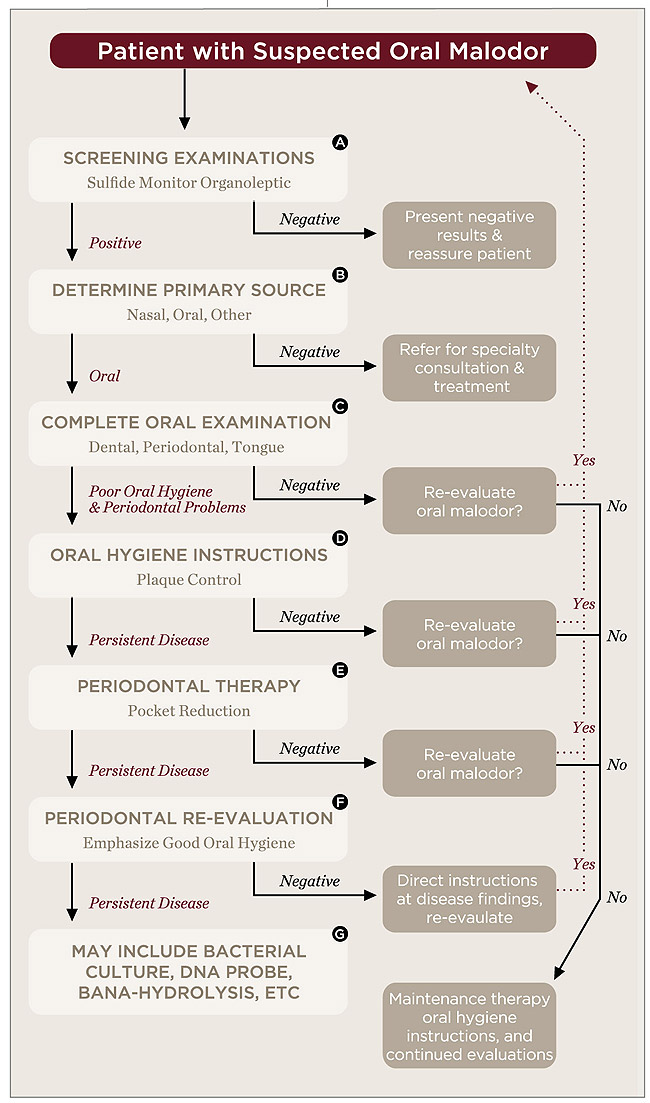 If the oral malodor is caused by periodontitis, traditional scaling and root planing in the dental office may alleviate the depth of the periodontal pockets and severity of gingival inflammation.2 As a result, plaque elimination correlates with fewer odor-causing bacteria of the mouth. Treating malodor caused by periodontitis requires a careful initial evaluation and diagnostic plan,2 such as the one shown in Figure 3. Chlorhexidine can be administered to ease gingivitis and plaque buildup in patients with gingival disease.1 However, extended use of the product should be avoided because the rinse can discolor the teeth and tongue eventually. Overusing the product could cause resistance of certain bacteria to the formula and, therefore, lower its efficacy.1 Rather than for the main intention of treating oral malodor, chlorhexidine primarily is prescribed to cleanse underneath the gingiva of patients who have periodontitis. In turn, the rinse also relieves the mouth of foul odor after expulsing the accumulated bacteria. Patients may be advised to use oral irrigation systems with a chlorine dioxide mouthrinse to reach between teeth and under the gingiva; subgingival irrigation tips can be used if the pockets are deeper than 4 mm to 4.5 mm.27 An antimicrobial gel can be used to brush the gingiva, cheeks, and roof of the mouth, which should be left on without rinsing.27 Just as with all patients, providing oral hygiene education is a necessity for successful treatment of periodontal disease.2