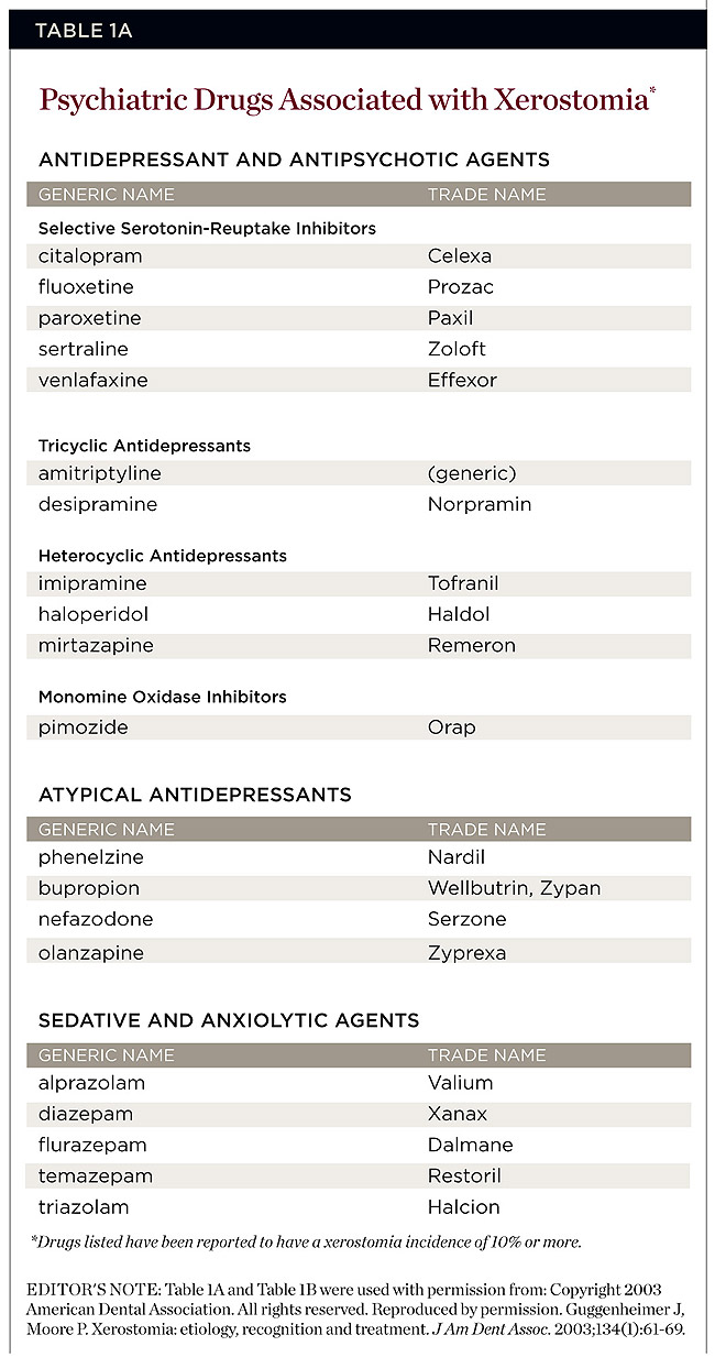 Saliva plays a central role in the formation of oral malodor. One of the functions of saliva is to purge any remaining food debris from the oral cavity. Periodontal pockets can cause food debris to accumulate and the rate of foul-odor production to increase.2 Some medications may cause xerostomia and result in oral malodor, especially those with anticholinergic activity. Such medications include antihistamines (eg, astemizole, brompheniramine), tricyclic antidepressants (eg, amitriptyline, desipramine), diuretics (eg, chlorothiazide, furosemide), antihypertensives (eg, captopril, clonidine), and analgesics (eg, codeine, meperidine) (Table 1A and Table 1B).3 Sympatholytics also can cause xerostomia. They include α-blockers (eg, terazosin), α-2 agonists (eg, clonidine), and ß-blockers (eg, metoprolol).4 Oxazepam, which is a muscle relaxant and sedative, has side effects that include xerostomia; however, this is temporary.5